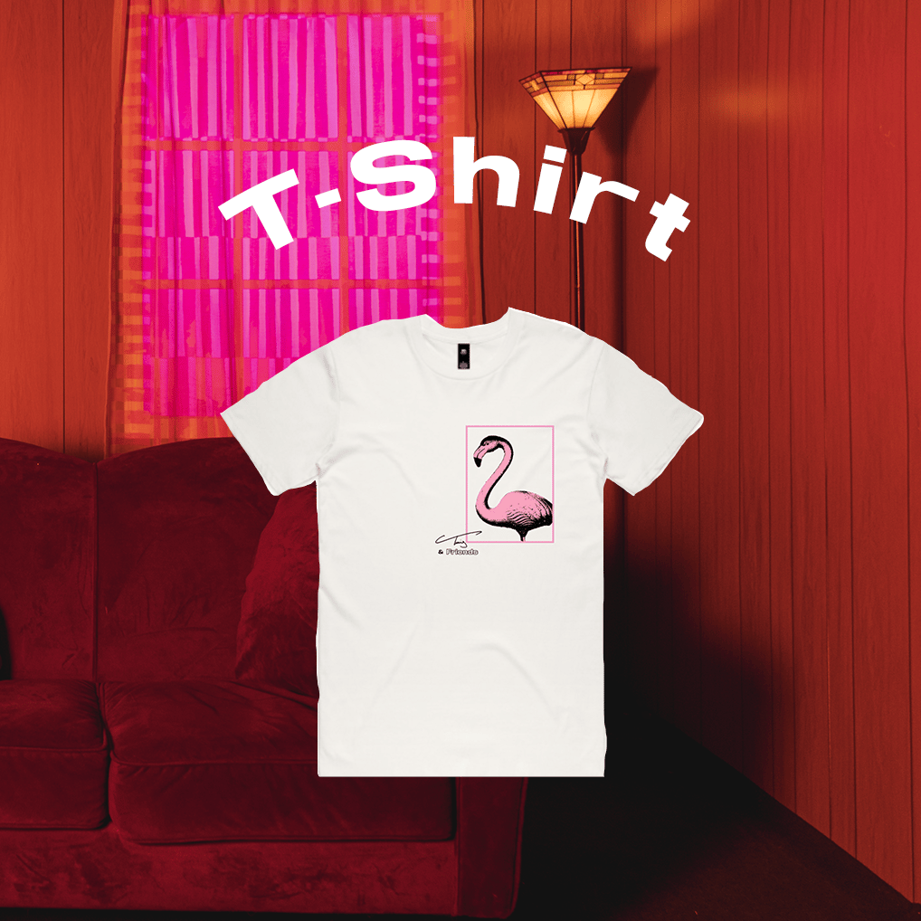 Off-white tee shirt featuring "Treis & Friends" logo accompanied by a two-tone flamingo design, inspired by natural Florida as part of the band's visual identity.
